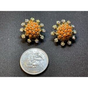 Vintage BSK Gold Tone Orange Bead A/B Crystal Clip On Earrings