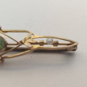 This exquisite gold brooch features a stunning green gemstone at its center that looks to be a peridot with small pearls on either side perfect for adding a touch of elegance to any outfit.