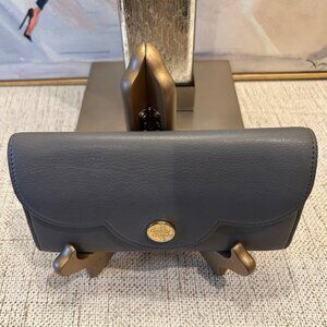 Beautiful Grained calfskin continental wallet in Motty Grey. Logo-engraved hardware, and concealed patch pocket and six card slots at face. Zippered coin pouch at back face. Fold-over flap with scalloped edges and press-stud fastening. Embossed logo, note slot, and six card slots at two-compartment interior. Textile lining in black. Gold-tone hardware. This wallet is in very good condition with the exception of the tarnishing on the flap logo hardware. The leather is in excellent condition. There is a little coin residue in the inside coin pocket. Please refer to the pictures.