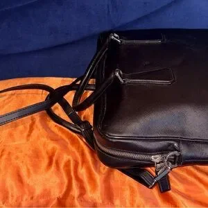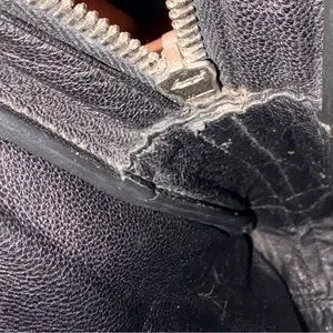 Features a leather body, rolled handles, unbranded and detachable shoulder strap, top zipper closure, interior zipper and slip pockets.