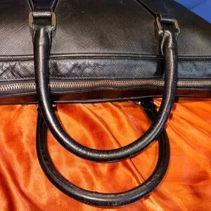 Elegant black leather briefcase by Prada. Ideal for business and travel. Features sturdy handles and a sleek design.
