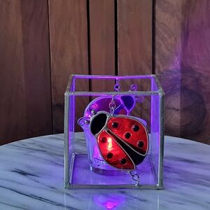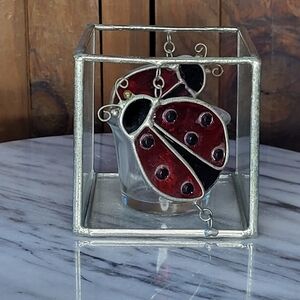 Add a touch of whimsy to your home with this charming stained glass ladybug candle holder. The vibrant red and black colors create a striking contrast, perfect for any decor. No chips or cracks and is in excellent original condition. $35