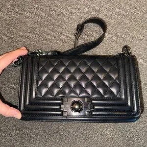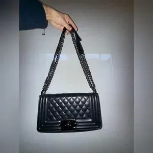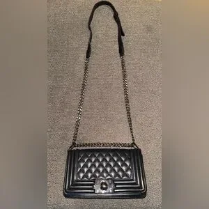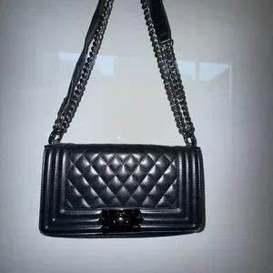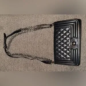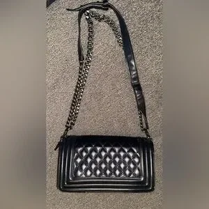 This stylish black quilted shoulder bag is perfect for any occasion. Its sleek design and chain strap add a touch of elegance to your outfit.