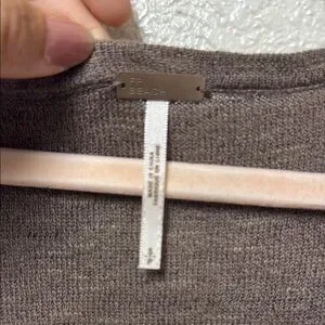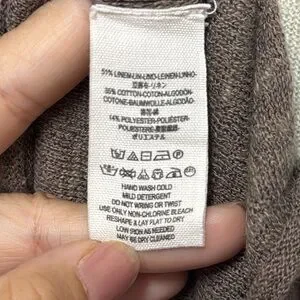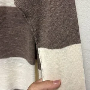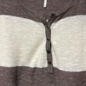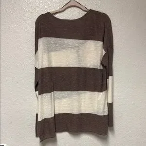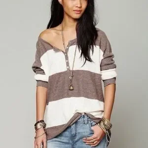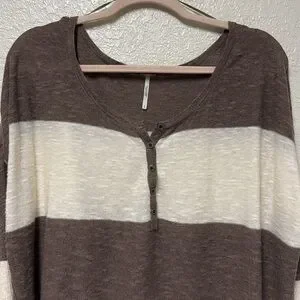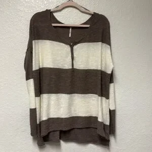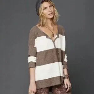 Stylish brown and cream striped women's top with a comfortable fit. Perfect for casual outings. This Free People Beach Henley Sweater Top is the perfect addition to your wardrobe. The linen blend material is soft and comfortable, ideal for a casual beachy look. The brown and white striped pattern is both trendy and timeless, making it a versatile piece that can be dressed up or down. With a round neckline, long sleeves, and a size small fit, this sweater is perfect for women who want a relaxed yet stylish look. The Henley style adds an extra touch of detail to the piece, making it stand out from other sweaters.