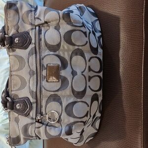 This is a beautiful silver and gray coach shoulder tote in great used condition. It has a front zipper pocket and a fuchsia pink satin lining. Still has plenty of life. It's gorgeous!
