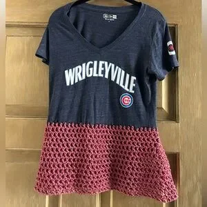 Chicago Cubs Wrigleyville shirt with crochet (done by me) bottom. Red yarn gives a flirty see through bottom and is a bamboo blend to keep you cool during summer games. One of a kind fan gear! Machine washable gentle cycle. Size small.
