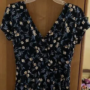 V Neck - Faux Wrap. Perfect for any occasion. Look great in this dress while you are comfy in this stretch fabric. This dress features a beautiful floral pattern on a navy background.