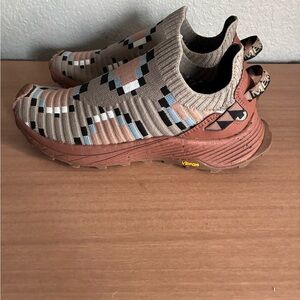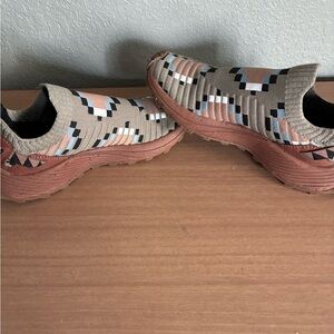 Hard to find women’s size 5.5 Merrell slip-on shoes with a geometric knit pattern. Features tan, black, and light blue accents. The Merrell Embark Sneaker Moc X Jordan Ann Craig Slip On hiking shoes are a stylish and comfortable option for outdoor activities. With a slip-on design and cushioned insole, these sneakers are lightweight and breathable, making them perfect for hiking and other outdoor adventures. The argyle/diamond pattern and brown color add a touch of style, while the rubber outsole provides traction and stability on various terrains. The limited edition collaboration with Air Jordan also adds a unique and sporty appeal to these athletic shoes.