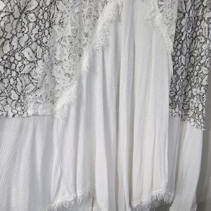Chic mini dress with black lace detail. Sleeveless and flowy. Ideal for versatile styling.