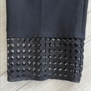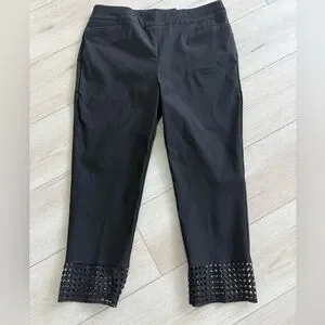 Chico’s Slimming Brigitte Slim Leg Pants — classic black with a stylish twist! These chic ankle-length pants feature a comfortable stretch fabric, pull-on waistband, and signature slimming panel for a flattering, smooth silhouette. The standout detail is the eye-catching geometric lace trim at the hem, adding a modern, feminine touch perfect for dressing up or down.