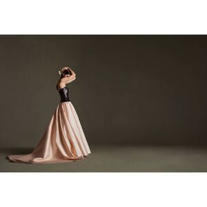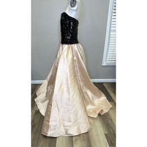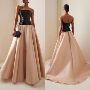 Flaunting mixed-media styling, Pamella Roland's strapless gown is complete with a sequin-embroidered bodice and a contrast satin skirt.