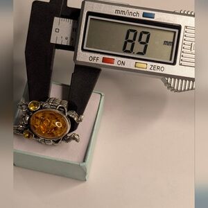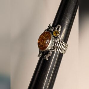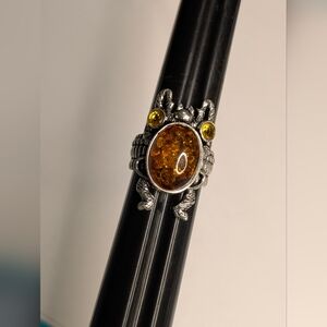 Make a bold, nature-inspired statement with this stunning Beetle Ring! The intricate silver setting is shaped like a realistic beetle, featuring an oval, deep orange Amber stone on its back. This unique piece also includes two small man-made accent Citrine stones that serve as the "eyes."