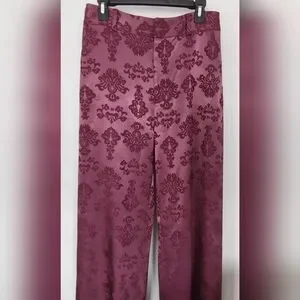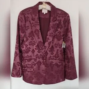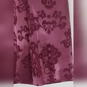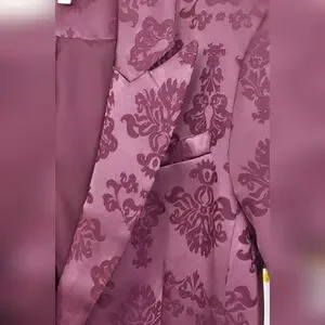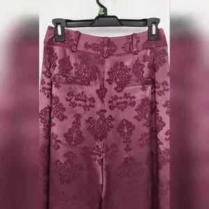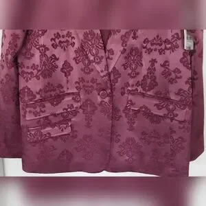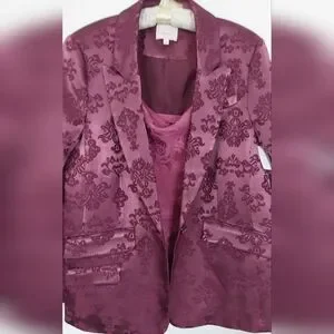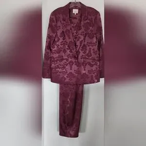 Cinq a Sept Faye Ravishing floral baroque satin 2 piece blazer and pant. (the underneath camisol is sold separately in my closet). In a stunning dark fig all lined in same color, the Blazer has padded shoulders and has a single matching button closure. This floral style features peak labels, one breast pocket, double waist front flap pockets, 5 button material matching back cuff buttons. The pant is high waisted, straight leg style in the same elegant dark fig satin. Front zipper with 2 hooks and button closure. There are functioning side pockets. The back has sewn darts above 2 pockets for a better fit. There are 5 belt loops, all lined. This suit is made of high-quality fabric and craftsmanship. Camisol is of a slightly lighter color that goes perfectly sold separately in my closet. Brand New.