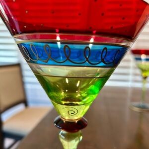 Vibrant martini glasses with red and green and blue accents. Elegant design with blue detailing. Perfect for entertaining. Or a quiet night for two ❤️