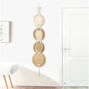 Stylish hanging organizer with cream and tan hats. Perfect for organizing and displaying hats.
