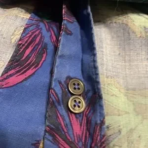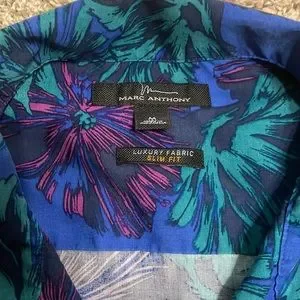 Marc Anthony Mens button down short sleeve shirt. Size medium in slim fit. Features a blue background with purple hibiscus flowers and green leaves. Lightweight and comfortable. Only worn once or twice and still has spare buttons.