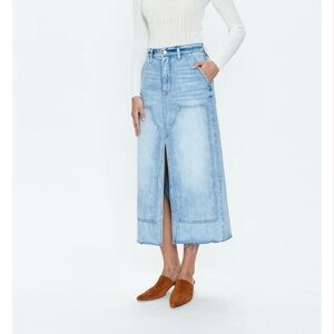 Of-the-moment, yet eternally stylish - our best selling skirt features an elongated midi length and five pocket denim design notes. Crafted from rigid denim without stretch for sophisticated fit and fall, with a well considered front skirt slit for ease of movement. Reimagined for the season with workwear inspired utility detailing in a light denim wash.