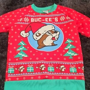 Festive red Christmas sweater featuring Buc-ee's design. has a fleece inside lining Perfect for holiday celebrations.