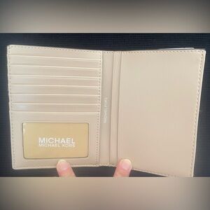 MICHAEL KORS METALLIC MK SIGNATURE FASHION FLAT PASSPORT CASE HOLDER ID CARD WALLET WITH CREAM COLOR INSIDE
