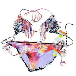 Raisins Bikini Set Womens Size Large Fringe Halter & Tropical Design Multi-Color