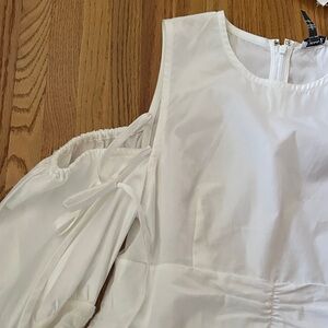 Chic white blouse with dramatic ruched sleeves. Perfect for elevating any outfit.