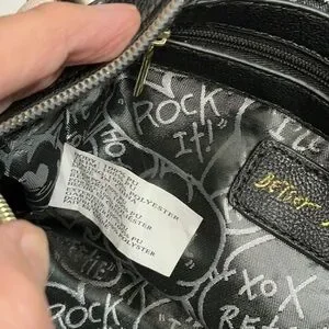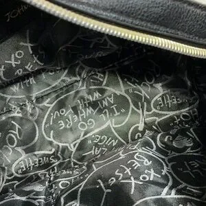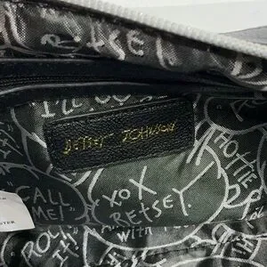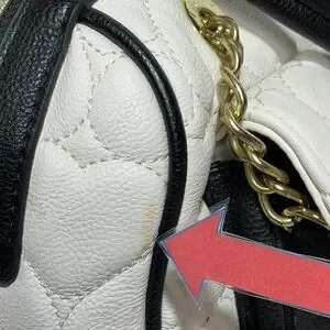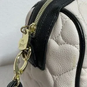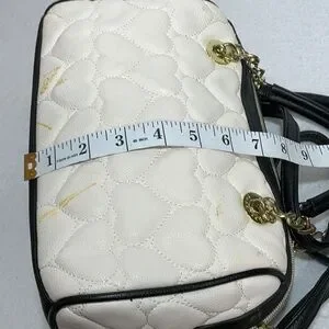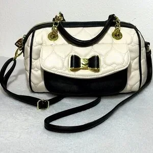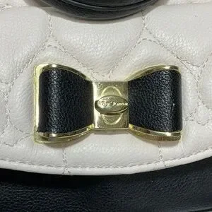 This Betsey Johnson sachel bag showcases a chic cream and black color palette, enhanced by elegant gold-tone hardware. NOTE: item has some stains on the back and side. Interior is very clean.