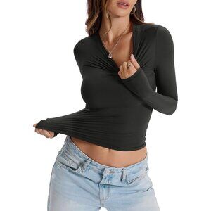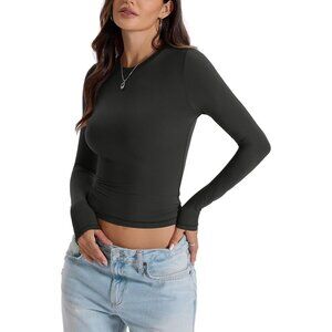 Women's Double Lined Long Sleeve Crop Top Fitted Crew Neck T Shirt