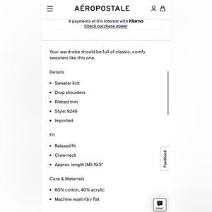 • features: This Aeropostale knit sweater features a cozy relaxed fit and on-trend drop shoulders. The textured sweater knit and ribbed trim create a comfortable and stylish piece perfect for a Boho, Minimalist, or Casual aesthetic. Crew neck design make it a versatile, everyday layering staple. No longer available on Aeropostale website.