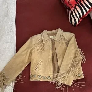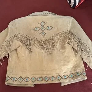 Scully Beige Fringe Leather Jacket with Turquoise Stud Accents