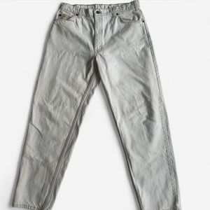 Vintage Orange Tab Levi’s 550 Tapered Leg Size 36x30. Gorgeous jeans!! These are LEGIT!! Have the R only on the tab which is only 10% of those made in the 90’s. Beautiful ivory cream color with just enough age to them to make them look vintage. Brown stitching. Some age stains near front pockets and some stitching pulled away at pocket but does not impact it at all.