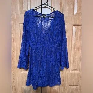 blue lace coverup. Features long sleeves and a flattering fit. Perfect for beach or poolside.