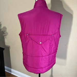 Bold fuchsia vest with a sleek design. Features snap buttons and high collar. Ideal for layering and adding vibrant style.