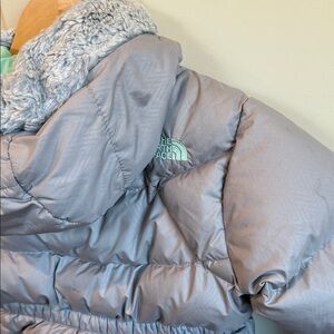 Stylish and warm puffer jacket. Features a sleek grey and teal color. Ideal for winter outings. Does have a small snag in the front. Has some staining please see photos. Great play jacket! Super warm. Have not tried to wash current stains.