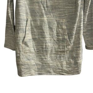 This Lou & Grey jacket is a women's medium, crafted from a blend of 48% rayon, 48% acrylic, and 4% spandex. It features a cozy hood, front kangaroo pocket, and offers a comfortable fit. The jacket is gray, solid in pattern, and ideal for casual fall occasions. It is machine washable for easy care. The jacket is pre-owned but in excellent condition.