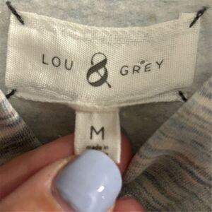 Keywords: Lou & Grey, women's jacket, medium, gray jacket, fall fashion, casual wear, hooded jacket, kangaroo pocket, machine washable, pre-owned, excellent condition, solid pattern, comfortable fit, basic jacket, cozy hood.