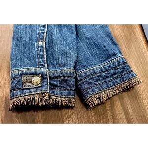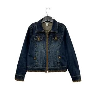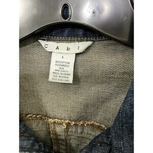CAbi Denim Jacket Brown Fringe Zip Front Pockets Size Large Belted Waist Stretch, 2 Hand pockets, 2 Chest pockets, Brown fringe accent at hem and cuffs, Belted Waist on Back, Detailed Buttons on Pockets and Cuffs, Cotton/Spandex. Excellent condition!