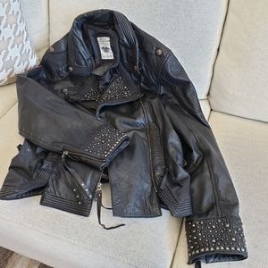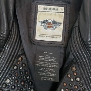 Black leather jacket with studded accents. Features zippered front and pockets. Classic Harley-Davidson style.
