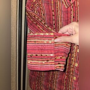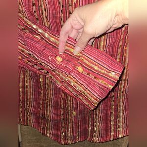 Y2k vintage maximalist 3/4 sleeve top featuring a vibrant red striped design, this shirt is perfect for any occasion. Comfortable and stylish, it's a must-have for your wardrobe. only known flaw is writing on tag pictured. approx measures pit to pit 18, pit to hem 11, sleeve length 14.5, width at cuff 5-6. (814)