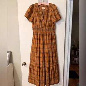 I don’t see this one come around too often and it’s a great color way, I just don’t love it on me so I don’t reach for it very often. Worn maybe three times. Size large and this one is Maeve brand but it’s the famous Somerset but Anthro. Almost a rust color with navy plaid stripes.