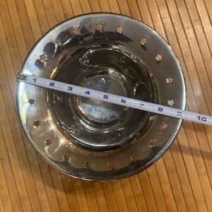 Vintage (silver color brass) brass moon and stars footed decorative bowl, trinket dish. Crescent moons on inside of bowl, cut out stars around upper edge. Some water spots on inside otherwise good condition. Approximately 9 inches in diameter, 4 inches tall.