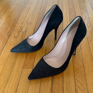 A low-cut topline livens up these glamorous pumps finished with a wrapped heel and pointed toe. Wavy topline Dusting of subtle glitter on vamp & wrapped heel Stiletto heel, Approx. 4" Suede upper, leather lining and sole Dust bag included Minor scuffing on leather sole, otherwise perfect condition