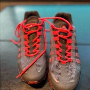 Vibrant Nike Air Max 95 sneaker in a grey and bright pink/orange colorway. Gently Used shoes with a bold red and gray color scheme. Ideal for active lifestyles. Like new no box.