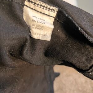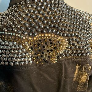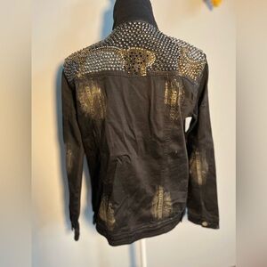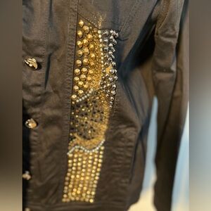 Stylish black jean jacket with eye-catching embellishments. Perfect for a bold look. 92% cotton, gorgeous structure to the coat. One stone is missing in the button, no other rhinestones are missing.