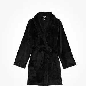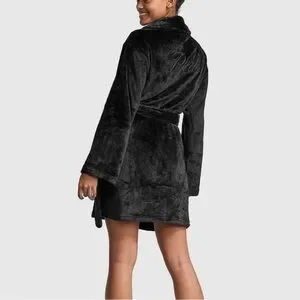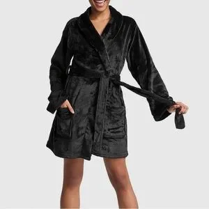 Indulge in the luxurious comfort of this black plush robe from PINK Victoria's Secret, featuring a classic wrap style and a tie belt for a perfect fit. Its soft texture and relaxed fit make it ideal for lounging or post-bath relaxation.