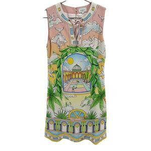 Casablanca 'Paysage' Green Ideal Graphic-Print Mini Dress Size FR 36/US 4: all-over graphic print, a-line silhouette, keyhole neck, front tie fastening, concealed rear zip fastening, sleeveless design, and scallop hem.
