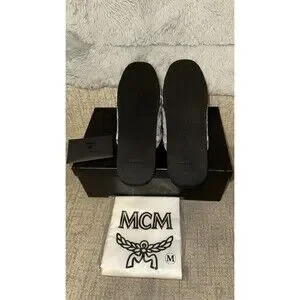 The product is a pair of MCM Vintage Signature Monogram Print Slippers in size M. These slip-on slippers are designed for men and feature a stylish blue color with a fabric upper material. With a comfortable medium shoe width, these slippers are perfect for lounging around the house or adding a touch of luxury to your outfit. Made by the brand MCM, these slippers come in a new in box condition, making them a desirable addition to any man's shoe collection.
