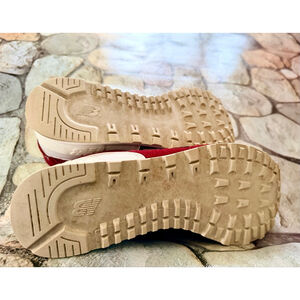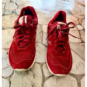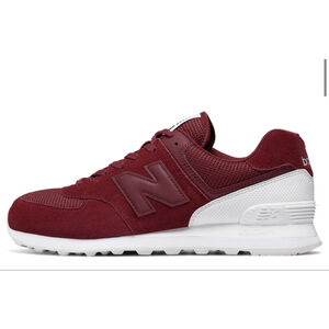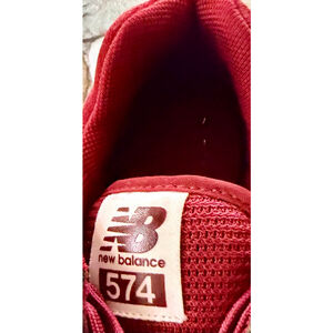 New balance. Size men 9. 574. Burgundy sneaker. Great condition. Very comfortable. Lace closure. Padded tongue. New balance logo on side of shoes and back of shoe. Non-slip sole. Vintage look. Classic sneaker. Round toe. Sole wear shown in photo.