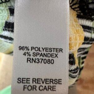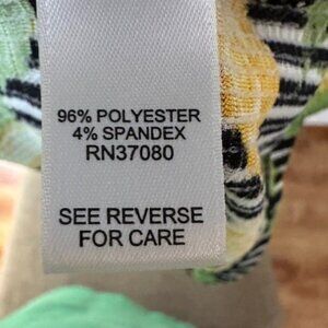 The Cato Women's Medium Blouse is a stylish and versatile addition to any woman's wardrobe. Featuring a fun lemon motif on a pin striped background, with a black criss cross in the back, this blouse offers a fresh and colorful look. Made from a blend of polyester and spandex, it provides both comfort and style. With a scoop neckline and short sleeves, this blouse is perfect for everyday wear and can be dressed up or down to suit any occasion.