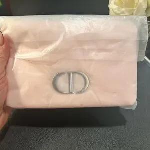 Elegant and stylish, DIOR Pink Puff Make up Pouch w/ logo comes with chain so you can use it as a crossbody. Perfect for every day. The soft pink color adds a touch of femininity, while the iconic Dior logo enhances its luxury appeal.