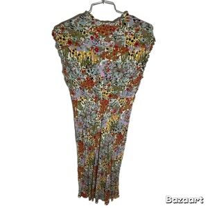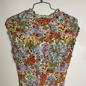Fossil impressionist- abstract vibrant floral print dress. V-neck with mini ruffle details and cut on the bias skirt.